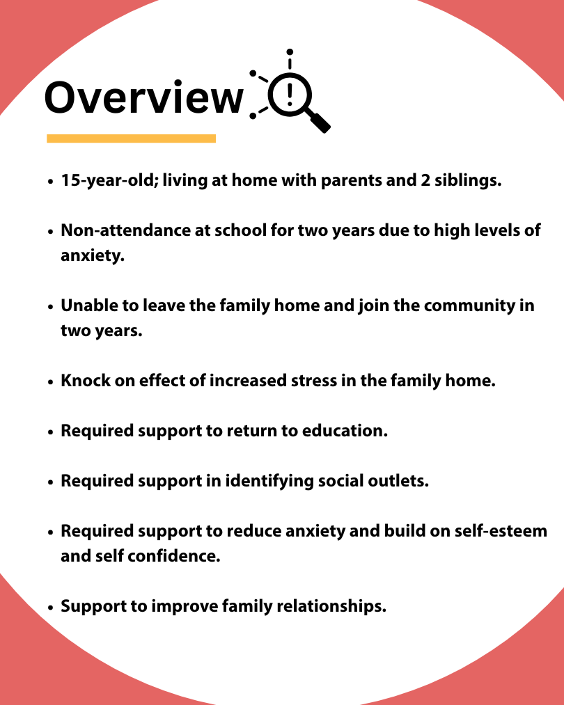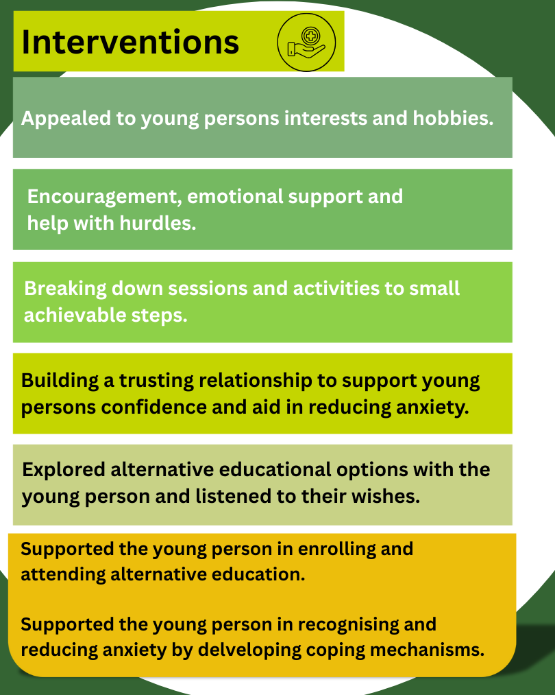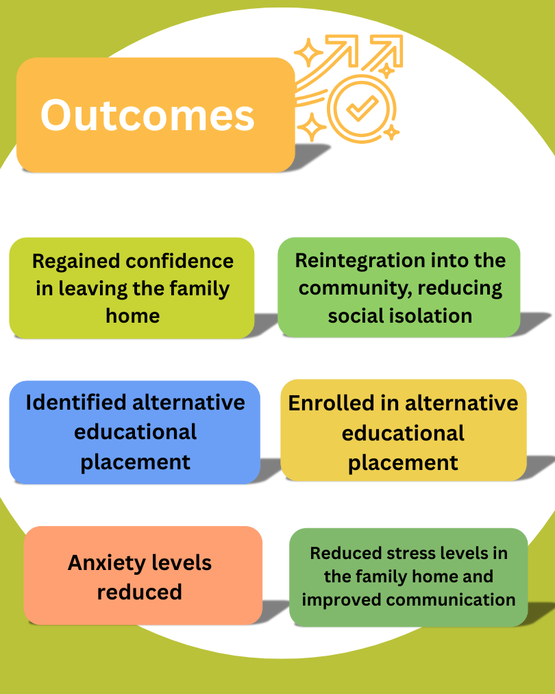 The intensive support of up to 15 hrs a week over 6 months provided to young people and their families using a strengths based, needs led approach leads to positive outcomes for the young people, their families, their community and referral agents.